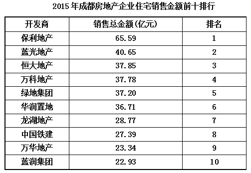 2015年,保利以全年銷售額超65億人民幣連續(xù)六年蟬聯(lián)成都樓市銷冠,位居第二的藍光地產(chǎn)銷售額共約40億。