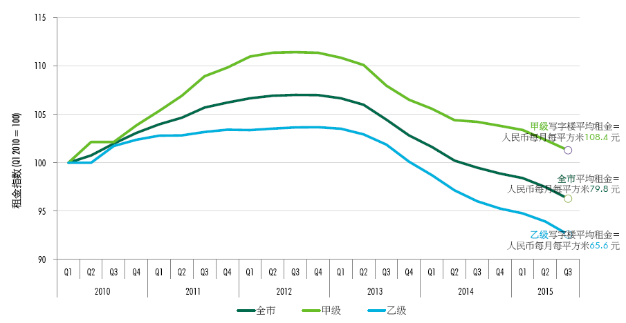 隨著新增供應(yīng)入市和空置率持續(xù)走高,成都寫字樓租金自2013年后也持續(xù)下降。