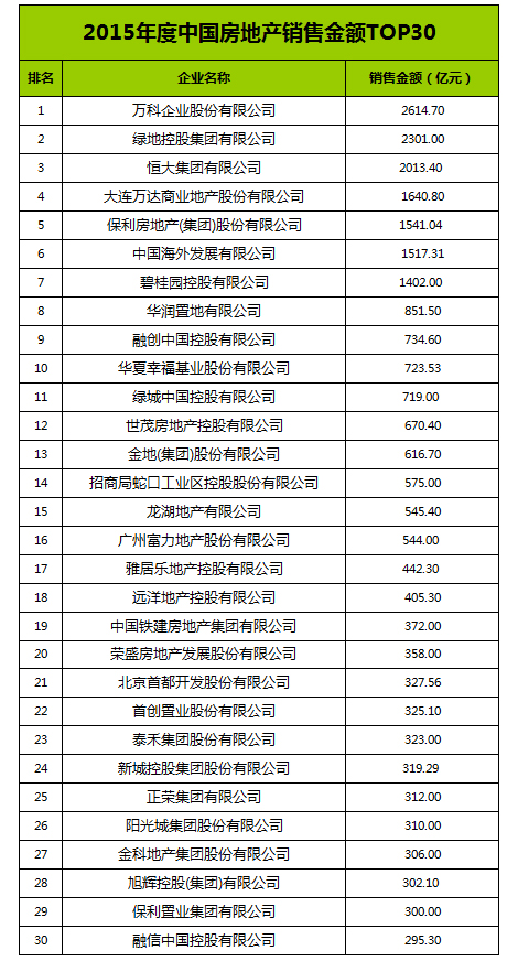 以下為2015年度中國房地產(chǎn)銷售金額TOP30榜單排名: