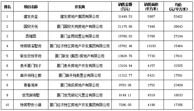 廈門區(qū)域房地產(chǎn)項目一周銷售數(shù)據(jù)(2016年3月28日-4月3日)