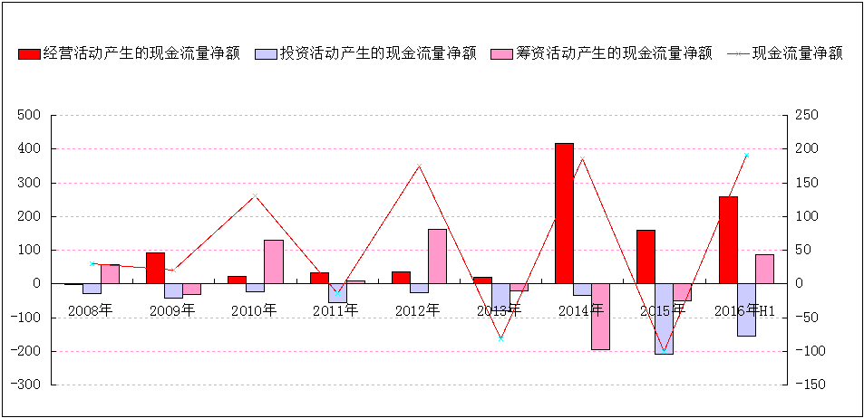 2008-2016年萬科現(xiàn)金流量整體分析圖