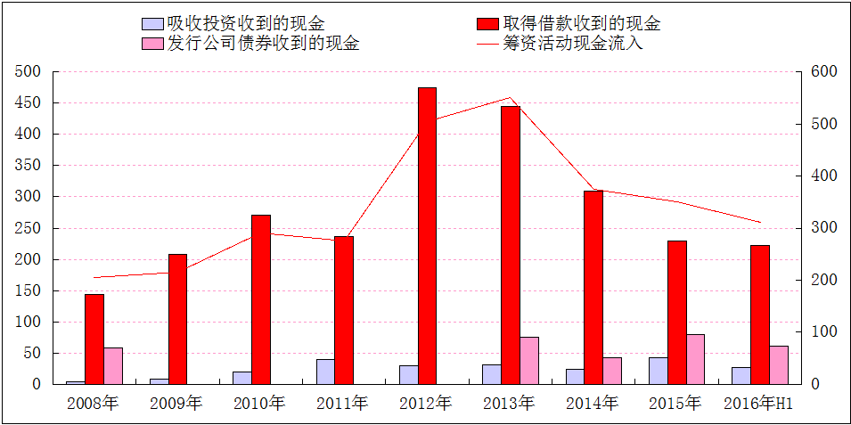 2008-2016年上半年萬科籌資活動現(xiàn)金流入明細(xì)