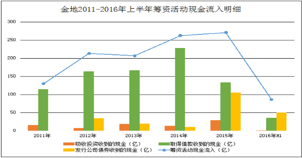 粗略計算,金地于2015年發(fā)行債券收到的現(xiàn)金為105億,2016年則為50億,這令其債務(wù)結(jié)構(gòu)與前幾年大為不同——2011年-2014年,金地融資中以銀行借貸占大頭,但是2015以及2016年,其債券方面的融資占比大大提升。