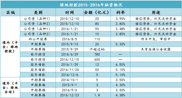 綠地控股2016年半年報告顯示,截至2016年6月30日,綠地控股獲得主要貸款銀行的授信額度為2694億元,已使用額度為1427億元,未使用額度為1267億元。