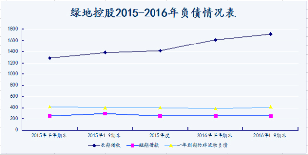 從債務(wù)結(jié)構(gòu)來看,綠地控股的長短借款占比有小幅的優(yōu)化。2015年半年、三季度、年度以及2016年半年、三季度,綠地控股的短期借款為254.49億元、295.32億元、255.35億元、258.55億元和248.41億元;長期借款則為1289.40億元、1389.53億元、1419.73億元、1615.21億元和1724.6億元。
