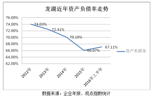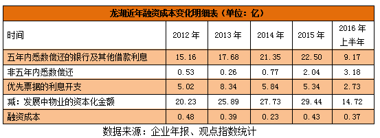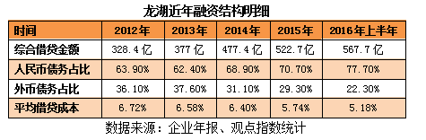 其中,人民幣債務(wù)占比從2013年占比62.4%一路上調(diào)至2015年的70.7%,2016年上半年甚至高達(dá)77.7%。國(guó)內(nèi)較寬松的融資環(huán)境也讓龍湖得以以較低的利率發(fā)債,平均借貸成本從2013年的6.58%下降至2015年的5.74%。