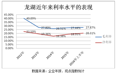 盡管2013年以來(lái)地價(jià)飛漲,龍湖總體毛利和凈利較2012年有所下降,但在后面幾年伴隨投資物業(yè)不斷發(fā)力,在房地產(chǎn)總體步入盈利趨薄的情況下,龍湖的毛利率和凈利率得以維持穩(wěn)定。