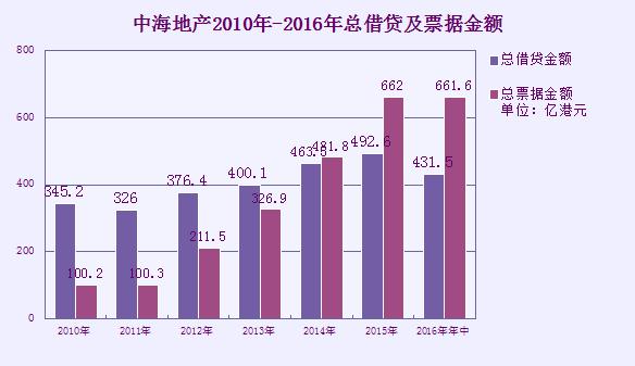 據(jù)中海財務報告顯示,2010年總票據(jù)金額為100.2億港元,但2016年6月30日,此數(shù)字已經(jīng)上升至661.6億港元,漲幅約5.6倍。