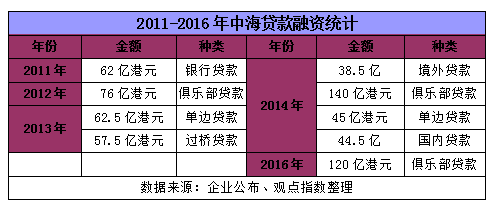 觀點指數(shù)統(tǒng)計,中海從2012年至今的貸款包括了俱樂部貸款、單邊貸款、過橋貸款、境外貸款、國內貸款等形式,最多一次貸款金額達140億港元。