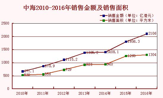 從開源方面來看,中海近幾年的銷售出現(xiàn)了穩(wěn)定的增長。2010年至2016年,中海的銷售金額分別為671.1億港元、870.9億港元、1115.2億港元、1385.2億港元、1408.1億港元、1806.3億港元和2106億港元。
