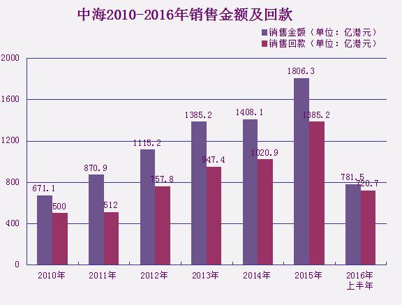 更為關鍵的是,中海一直在提高回款率。以2016年上半年為例,中海的銷售金額為781.5億港元,回款就達到了720.7億港元,回款率達92%。