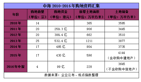 這幾年中海的購地資金分別為259.5億港元、388.4億港元、532.4億港元、485億港元和430億港元,2016年上半年購地資金為99億港元。