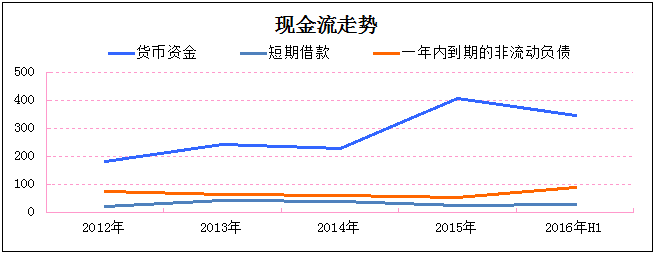 2012年至2014年期間,招商蛇口貨幣資金僅略高于短期借款及一年內(nèi)到期的非流動負(fù)債;此后隨著銷售規(guī)模增長及與銀行加強合作,至2016年上半年總持有貨幣344.69億元,對應(yīng)短期借款及一年內(nèi)到期非流動負(fù)債僅為117億元。