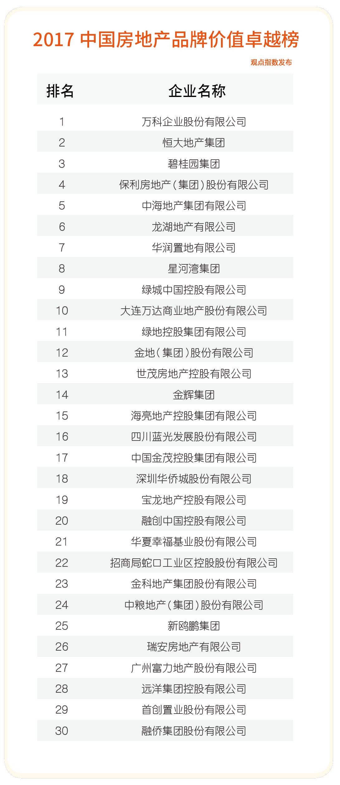 2017中國房地產(chǎn)品牌價值卓越榜,旨在表彰那些在2016年度全力提升競爭力,營造出色品牌知名度、品牌美譽度和品牌忠誠度,并打造出優(yōu)秀品牌價值的房地產(chǎn)企業(yè)。