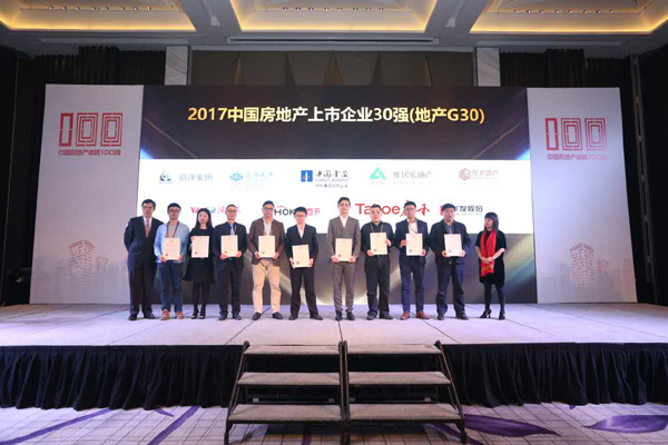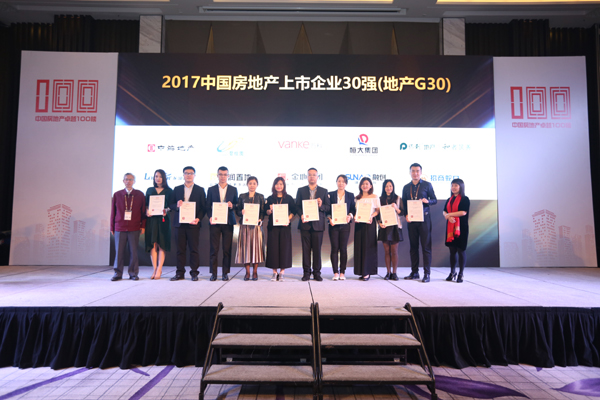 尊敬的各位來賓,現(xiàn)在正在發(fā)布2017中國房地產(chǎn)上市企業(yè)30強(地產(chǎn)G30),一共有30家企業(yè)入榜。表彰的是位于行業(yè)頂尖位置的房地產(chǎn)上市企業(yè)。恭喜剛剛臺上獲獎的各位企業(yè)來賓,你們的努力是我們一同堅持前行的動力。