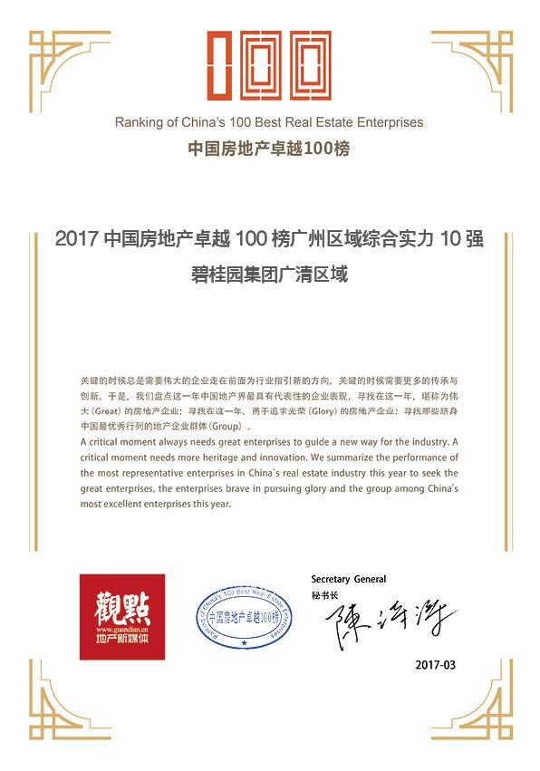 碧桂園集團(tuán)廣清區(qū)域榮獲“2017中國房地產(chǎn)卓越100榜廣州區(qū)域綜合實力10強(qiáng)”證書