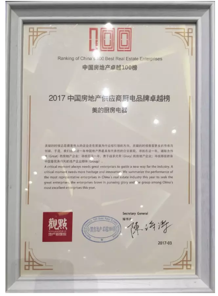 2017年3月22日,由觀點(diǎn)新媒體主辦的“2017中國房地產(chǎn)卓越100榜發(fā)布盛典”在深圳舉行,評選和表彰過去一年卓越、杰出與非凡的房地產(chǎn)及相關(guān)產(chǎn)業(yè)鏈企業(yè)群體。美的廚電作為廚電行業(yè)內(nèi)的唯一代表,與中國最優(yōu)秀的房地產(chǎn)企業(yè)共同參與盛會,榮獲“2017年中國房地產(chǎn)供應(yīng)商廚電品牌卓越獎”。