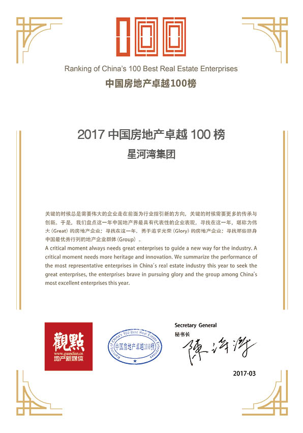 星河灣榮獲“2017中國房地產(chǎn)卓越100榜”證書