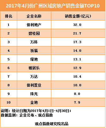 盡管整體成交回落,但長(zhǎng)期登頂觀點(diǎn)指數(shù)廣州區(qū)域房地產(chǎn)銷(xiāo)售金額榜單的企業(yè)的“地位”并未受到撼動(dòng)。保利地產(chǎn)、碧桂園和萬(wàn)科分別以32.0億元、21.7億元和17.3億元的銷(xiāo)售金額奪得4月份榜單的前三甲;于3月份,它們的成績(jī)分別為36.9億元、32.4億元和20.9億元。