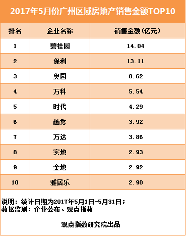雅居樂僅憑2.9億元便進(jìn)入觀點(diǎn)指數(shù)廣州區(qū)域月度銷售金額TOP10,奧園則以8.62億元的銷售成績于本年度第一次現(xiàn)身該榜單,碧桂園和保利分別取得14.04億元和13.11億元,位居冠軍和亞軍。