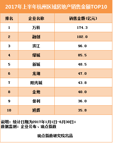 雖然商品房銷量同比下跌,但在杭州房企2017上半年排行榜中,排名前十的房企銷售總額達到708.9億,比去年增加7.6%,排名前三的企業(yè)銷量占整個榜單的52.5%。