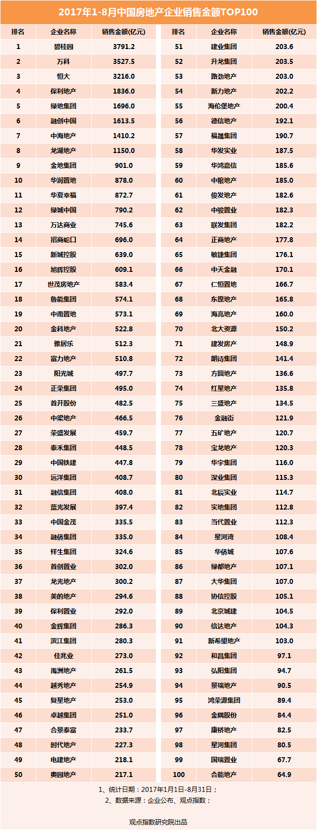 截止到2017年8月底,觀點(diǎn)指數(shù)統(tǒng)計(jì)已經(jīng)總共91家房企突破百億銷售,下一個(gè)月,這個(gè)數(shù)字很有可能突破100家。