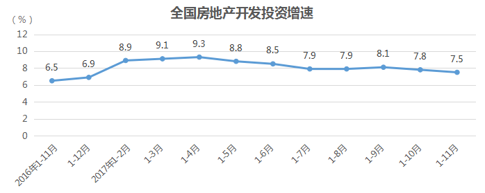 國(guó)家統(tǒng)計(jì)局?jǐn)?shù)據(jù)顯示,2017年1-11月份,全國(guó)房地產(chǎn)開(kāi)發(fā)投資100387億元,同比名義增長(zhǎng)7.5%,增速比1-10月份回落0.3個(gè)百分點(diǎn)。其中,住宅投資68670億元,增長(zhǎng)9.7%,增速回落0.2個(gè)百分點(diǎn)。住宅投資占房地產(chǎn)開(kāi)發(fā)投資的比重為68.4%。