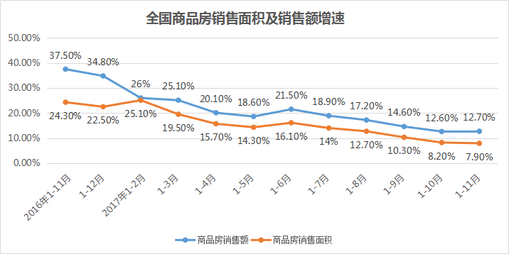 但另一方面,2017年全國(guó)商品房銷(xiāo)售金額和銷(xiāo)售面積增速呈現(xiàn)逐月下降的趨勢(shì),到10月份,已經(jīng)回落至新低點(diǎn)。