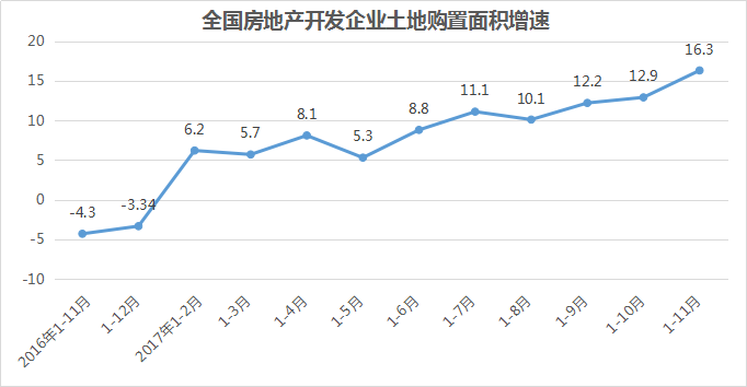 1-11月份,房地產(chǎn)開(kāi)發(fā)企業(yè)土地購(gòu)置面積22158萬(wàn)平方米,同比增長(zhǎng)16.3%,增速比1-10月份提高3.4個(gè)百分點(diǎn);土地成交價(jià)款11436億元,增長(zhǎng)47.0%,增速提高3.7個(gè)百分點(diǎn)。住宅用地成交樓面價(jià)繼續(xù)上漲,溢價(jià)率則開(kāi)始回落。