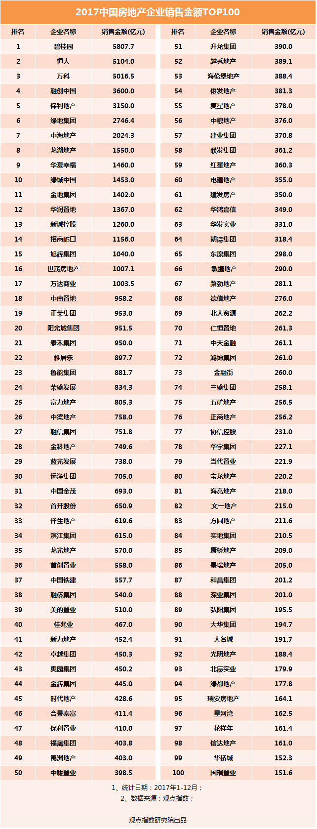 觀(guān)點(diǎn)指數(shù)·2017中國(guó)房地產(chǎn)企業(yè)銷(xiāo)售金額TOP100榜入榜100家企業(yè),全部均已達(dá)標(biāo)百億,最低金額超過(guò)150億。