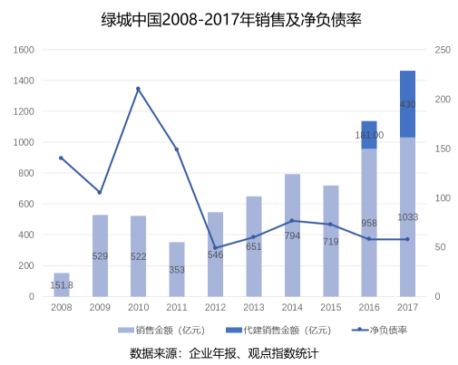 及至2016年、2017年,當(dāng)同行的銷售呈幾何級增長時,綠城則在代建的支持下,連續(xù)兩年完成了千億的業(yè)績。雖然增長相對緩慢,但也基本保證了不會掉隊的局面。據(jù)觀點指數(shù)統(tǒng)計,2017年,綠城以1463億的銷售額位列房企銷售排行榜第10位。