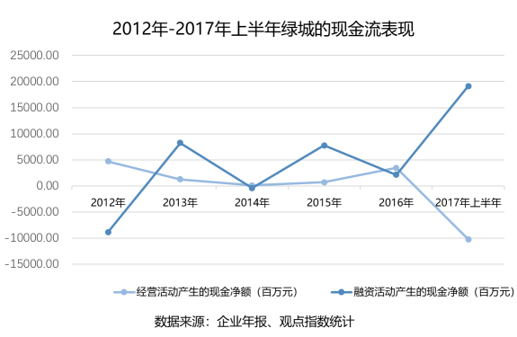 2017年上半年,綠城出現(xiàn)大量的經(jīng)營活動現(xiàn)金流出,而這一年綠城在土地投資上的也支出大大超過前幾年。