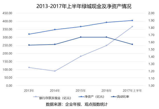 現(xiàn)金方面,數(shù)據(jù)顯示在2014年的低谷后,綠城銀行存款及現(xiàn)金的額度逐年上升,最新的2017半年報指出,綠城有銀行存款及現(xiàn)金367億元,較2016年末增加了117.65億元,是近五年來的最高點。