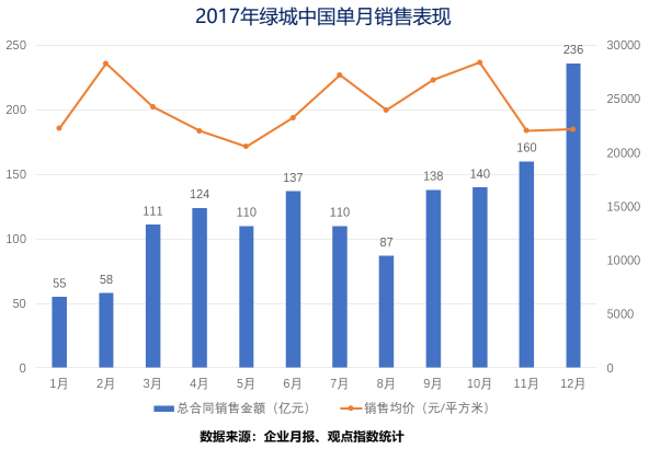 從2017年綠城每月的銷售情況也可看出,自3月份全國一二線的限購限價政策推出之后,綠城銷售金額基本都突破百億,銷售均價也隨之下降,說明綠城正在努力處理三四線的庫存。