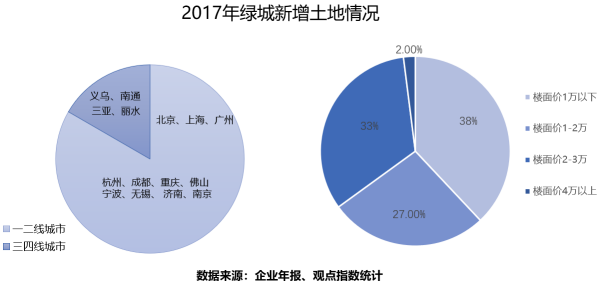 據(jù)觀點指數(shù)不完全統(tǒng)計,截至2017年12月底,綠城2017年的土地金額已達(dá)到570億,雖然和碧桂園、恒大、保利等拿地大戶相比仍有差距,但這一數(shù)字已經(jīng)遠(yuǎn)遠(yuǎn)超過其2014-2016年三年的買地總額。