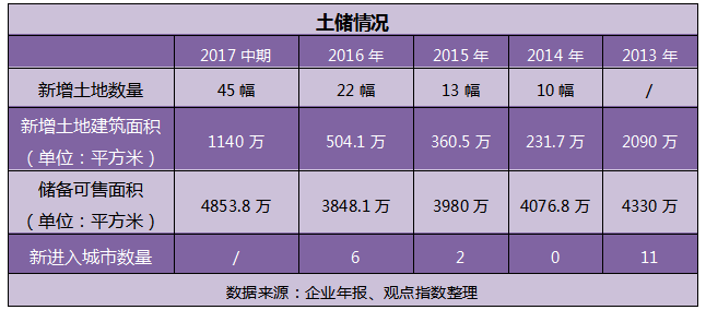 2017年,富力地產(chǎn)的擴(kuò)儲(chǔ)決心表現(xiàn)得更為明顯。截至2017年6月30日,已投入316億元購置45幅地塊,合計(jì)總建筑面積1140萬平方米,新進(jìn)入的城市為6座,可售儲(chǔ)備面積增至4853.8萬平方米。