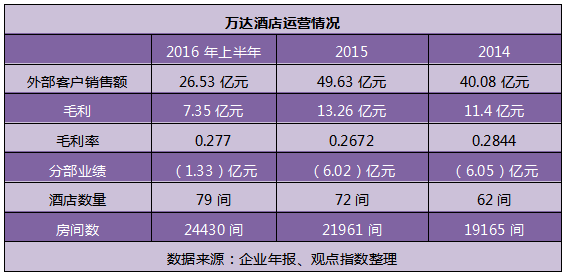 以六折價(jià)格一下子吃進(jìn)規(guī)模如此巨大的酒店資產(chǎn),問題在于這些酒店能給富力帶來多大的脾益?據(jù)觀點(diǎn)指數(shù)了解,2014年全年、2015年全年及2016年上半年,萬達(dá)酒店整體毛利率高于富力酒店,但表現(xiàn)在分部業(yè)績上,依然處于虧損狀態(tài),虧損幅度分別為-6.05億元、-6.02億元及-1.33億元。