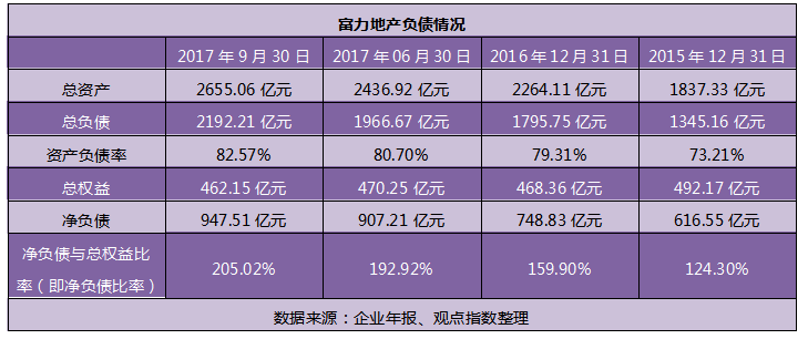 事實(shí)上,以2017年9月30日的數(shù)據(jù)來看,富力地產(chǎn)的總資產(chǎn)為2655.06億元,總負(fù)債為2192.21億元,總權(quán)益為462.15億元,凈負(fù)債為947.51億元;而2017年6月30日,這幾項(xiàng)數(shù)據(jù)分別為2436.92億元、1966.67億元、470.25億元和947.51億元。