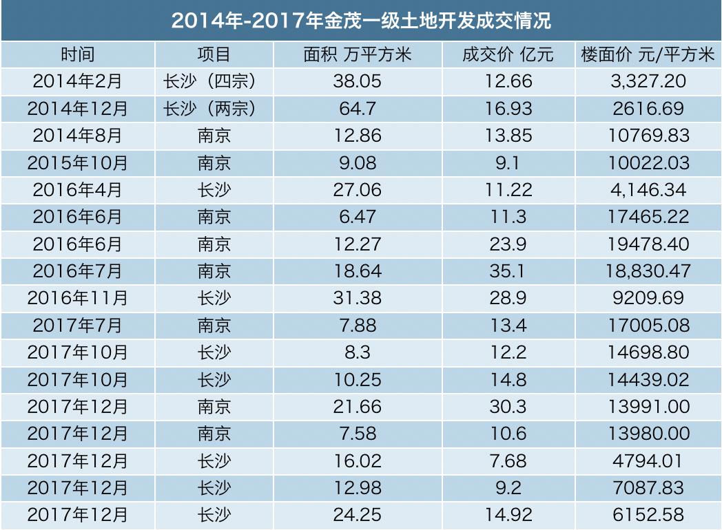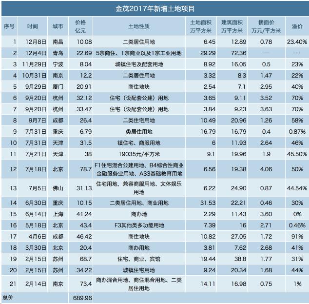 據(jù)觀點指數(shù)不完全統(tǒng)計,中國金茂2017年于公開土地市場上共獲取了21宗地塊,總價為690億元,新進入了溫州、成都等城市。根據(jù)興業(yè)證券調(diào)研報告披露,前10月中國金茂已累計獲取28個新項目,總建面達到600萬平方米,總土地款800億元,權(quán)益建面為280萬平方米,權(quán)益土地款為400億元。