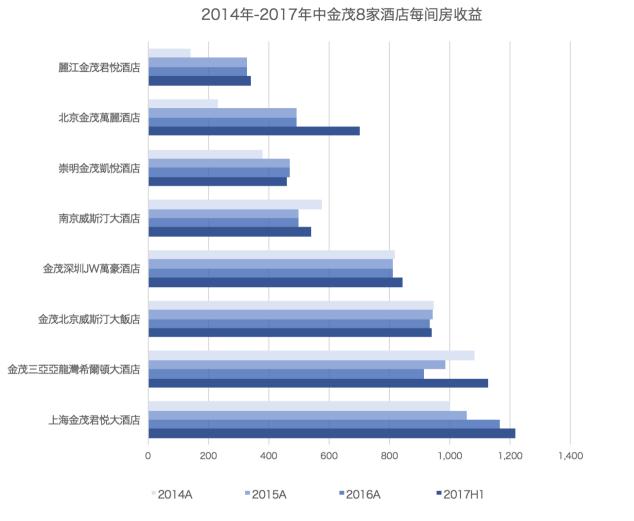 相對成熟且已經(jīng)上市的金茂酒店,在2017年上半年錄得12.88億元收入,毛利7.58億元。其中,位于上海金茂大廈的君悅大酒店是這幾年間能夠?qū)崿F(xiàn)每間房收益不斷增長的唯一一間酒店,除三亞亞龍灣希爾頓酒店及金茂萬麗酒店,其他幾間酒店的RevPAR未明顯增長。
