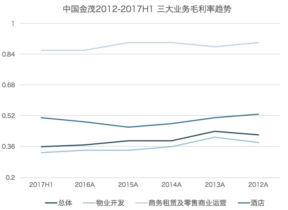 據(jù)觀點指數(shù)統(tǒng)計,中國金茂商務(wù)租賃及零售商業(yè)運營業(yè)務(wù)的毛利近幾年一直維持在85%以上,酒店毛利率也在50%左右,但受物業(yè)開發(fā)影響使得金茂的總毛利率被拉底。