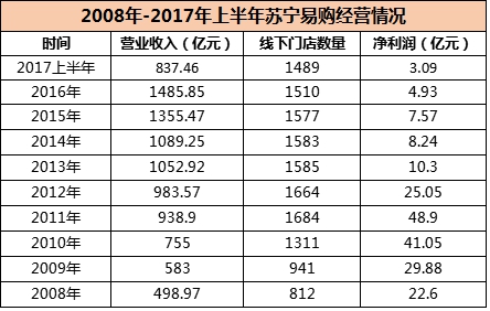 經(jīng)過連年關(guān)店,截至2017年上半年,蘇寧在大陸市場共擁有連鎖店面1489家,其中還包含204家蘇寧云店,而實際的常規(guī)店面僅有1214家,較2011年最高峰時期的1684家店面減少近28%。