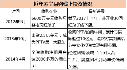 2013年初,蘇寧電器正式更名為“蘇寧云商”,這只實體零售的大象才真正開始轉(zhuǎn)身。為加速線上發(fā)展,缺乏電商基因的蘇寧采取的主要方式就是收購其他電商平臺。