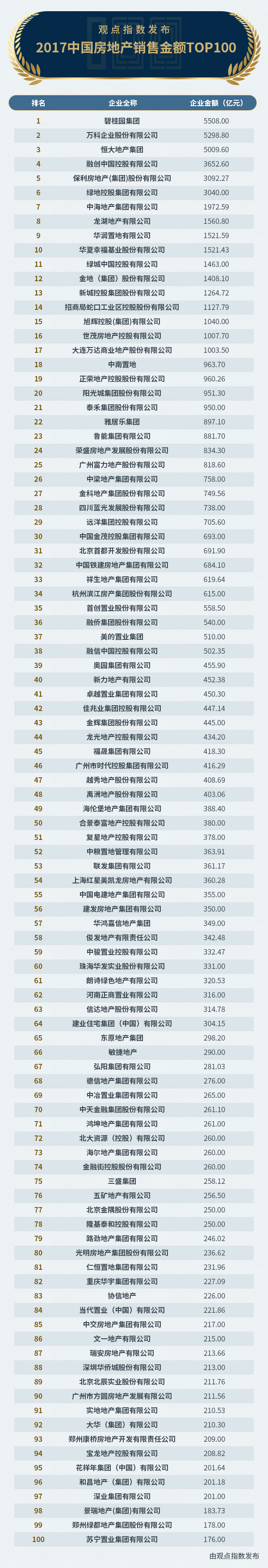觀點指數(shù)·2017中國房地產(chǎn)企業(yè)銷售金額TOP100榜入榜100家企業(yè),全部均已達標百億,最低金額超過170億。