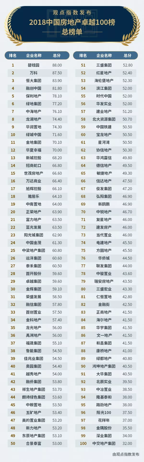 以下為2018中國房地產(chǎn)卓越100榜總榜單:
