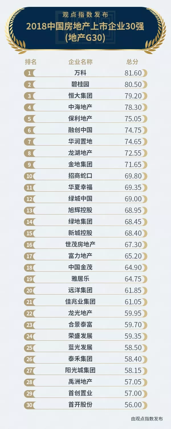 以下為2018中國房地產(chǎn)上市企業(yè)30強(qiáng)(地產(chǎn)G30):