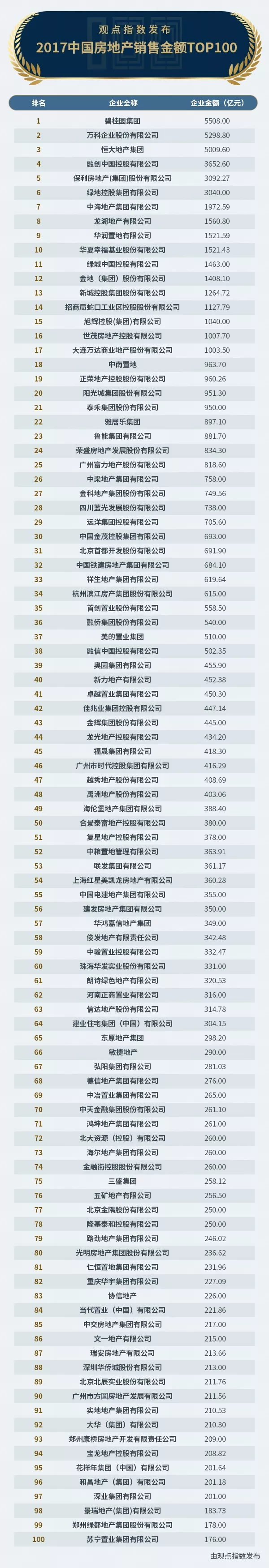以下為2017中國房地產(chǎn)銷售金額TOP100: