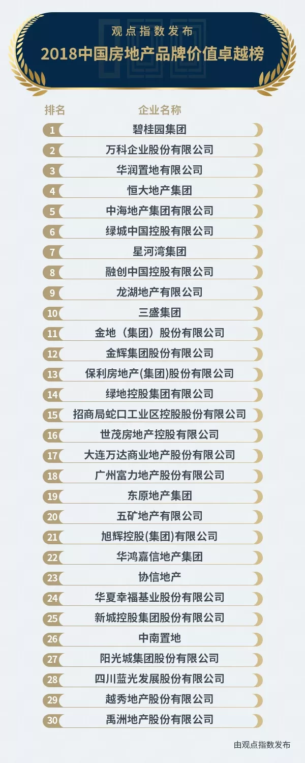 以下為2018中國房地產(chǎn)品牌價(jià)值卓越榜: