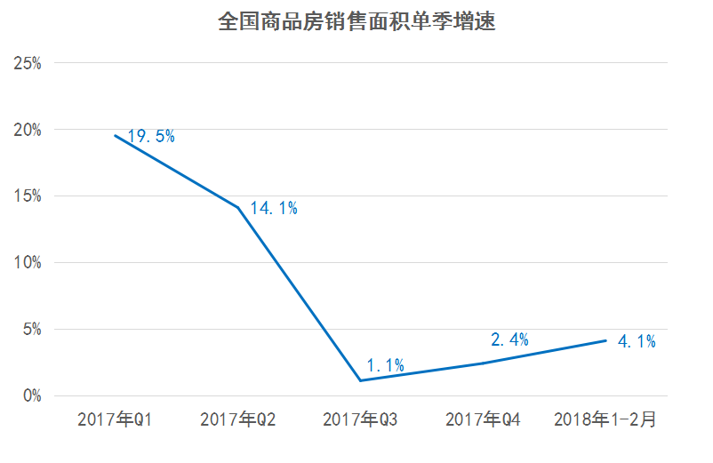 全國商品房銷售增速同樣出現(xiàn)放緩跡象,據(jù)國家統(tǒng)計局披露數(shù)據(jù),2018年1至2月,商品房銷售面積14633萬平方米,同比增長4.1%,增速比2017年全年回落3.6個百分點。按時間點看,1至2月全國商品房銷售面積增速4.1%,較2017年三四季度有所回升,但仍低于2017年一二季度水平,增速下降趨勢明顯。
