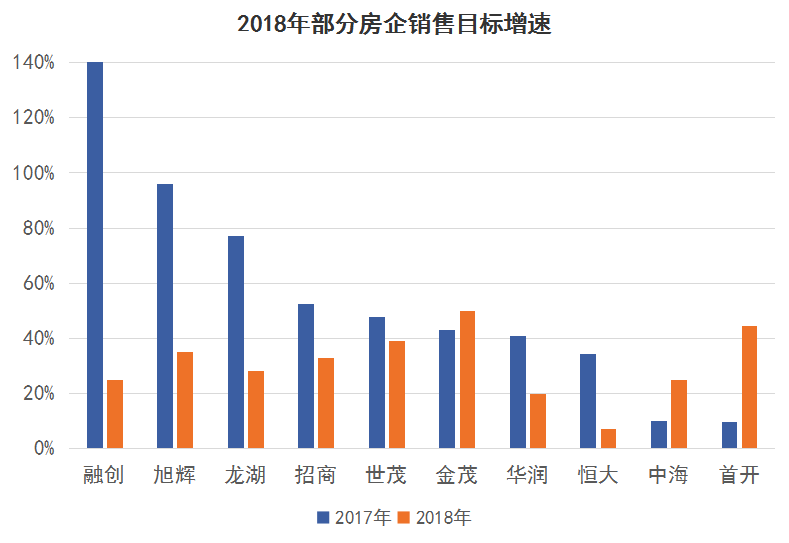 對于2018年,行業(yè)排名前列的房企都對銷售規(guī)模持相當謹慎的態(tài)度,對外宣布的公司目標溫和。據(jù)觀點指數(shù)不完全統(tǒng)計,銷售規(guī)模在千億以上的房企在制定2018年目標時,大部分增長率均低于去年同期水平。